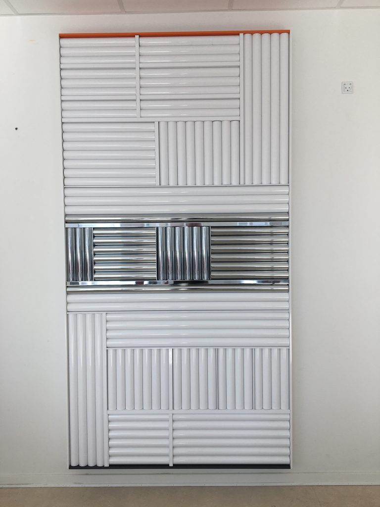 Relieffet er opdelt i 3 større flader. Forkromet midterparti der på hver side løber over i hvid og ender i farvet ramme i top og bund. Lodrette rammesider i hvid.